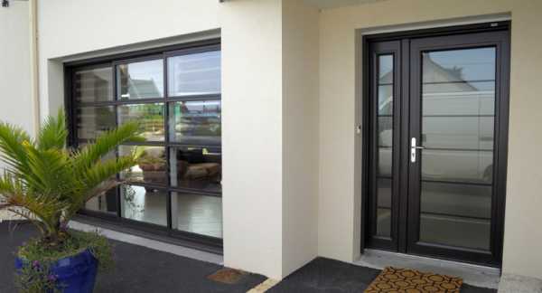 С фрамугой. В коробке увеличенной высоты установлено одно или два дверных полотна, а сверху декоративная вставка. Такая модель устанавливается в заранее спланированный, или нестандартной высоты проём. Необычная конструкция придаёт фасаду здания индивидуальность и респектабельность.