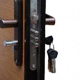 Металлопластиковые входные двери. Имеют эстетичный внешний вид, высокую прочность, долговечность. Относительно слабые защитные качества компенсируются одним важным преимуществом – отсутствием проблемы конденсата и наледи. Технологии изготовления ПВХ окон и металлопластиковых дверей практически одинаковы, но материалы и конструкция дверей отвечают более высоким требованиям надёжности и безопасности. Коробка и рама полотна выполнены из пятикамерного профиля, для жёсткости усиленного армирующим металлическим каркасом прямоугольного или, с учётом конструкции, сложного сечения. Металлокаркас позволяет оснастить двери более надёжными, мощными навесами и запирающими механизмами против взлома. Желательна комплектация двери стеклопакетом с триплексным или бронированным наружным стеклом.