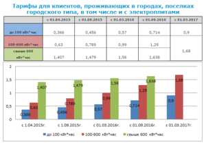 При однотарифном учёте общая стоимость одного киловатта электроэнергии с 1.01.2017 до 30.06.2017 составит 5,38 рубля. Но если жилой дом оборудован стационарными плитами или электроотопительными установками, то в этом случае прийдётся выложить несколько меньше т. е. 3,77 р./Квт*ч. А с 01.07.2017 тариф для указанной категории конечных потребителей вырастет до 4,04 р./Квт*ч. Рост составит чуть более 7%.