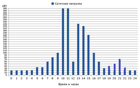 Статистика показывает, что расход электроэнергии по времени в течении суток распределяется не равномерно. Утром начинается рост, на дневное время приходится пик и падение — на вечернее. На графике снизу показано распределение расхода электроэнергии в течение суток в отдельно взятом районе населенного пункта: