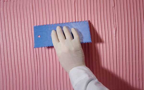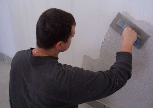 Приступая к работе, наложите шпателем небольшое количество материала на рабочую поверхность длинной гладилки. Теперь начните работу с любого верхнего угла. Действуйте так же, как при нанесении финишной шпаклевки, нанося смесь равномерным слоем. Участки у пола покрывайте движением снизу-вверх. Гладилку прижимайте к стене плотно, держа ее под углом 10—15° к поверхности. Следите за тем, чтобы не было пропусков.