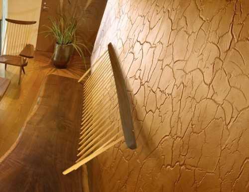 Разновидность этого метода позволяет получить не менее интересную фактуру из неокрашенной смеси. Для этого наштампованный валиком узор слегка затирают в разных направлениях. Особенно хорошо выглядит декоративная отделка, если узор на валике содержал мелкие детали. При желании можно обойтись без валика и использовать для отделки саму кельму, прижимая ее к стене, а затем отрывая в перпендикулярном к стене направлении. Получившиеся зубцы слегка затереть кельмой.