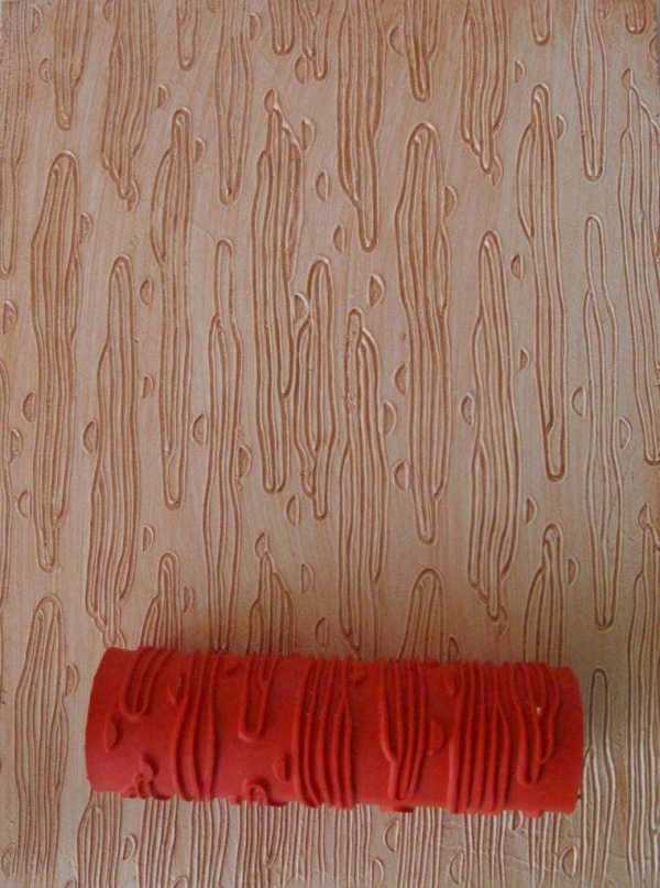 Для того чтобы не ошибиться при создании рельефа на стене, можно сперва потренироваться на небольшом кусочке деревянной доски. На следующем фото узор создается с помощью специального валика.