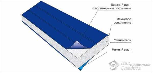 Сэндвич-панели предназначены для отделки фасада, они тоже состоят из трех слоев. Верхний и нижний слой сделаны из металлических листов, а между ними располагается утеплитель. Детали соединяются между собой горячим прессованием. Благодаря этому, материал отличается надежностью, прочностью и долговечностью. В качестве утеплительного материала при изготовлении сэндвич-панелей может применяться пенопласт, минеральная вата, стекловолокно и пенополиуретан.