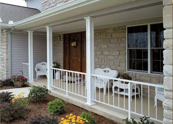 Можно украсить входную группу перилами, козырьком, интересными входными ступенями.