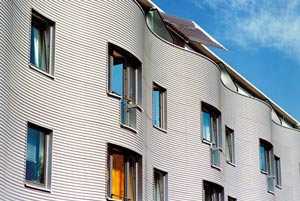 Сайдинг — это те же навесные панели с разной фактурой, имитирующей натуральные материалы. Но, в основном, сайдинг имитирует древесину. Сайдинг различают по составу сырья, из которого он изготовлен. Фиброцементный сайдинг выглядит так:
