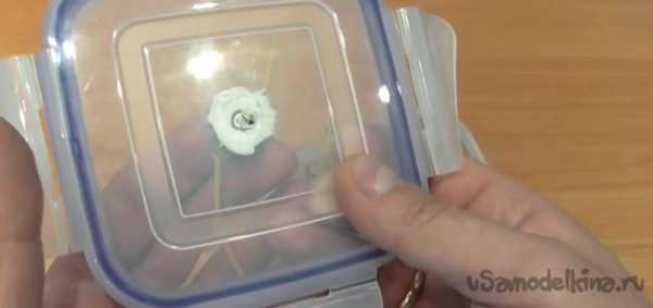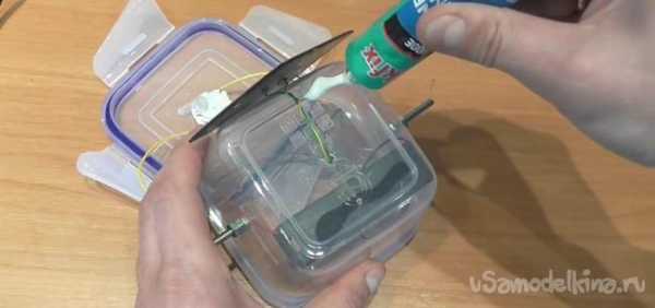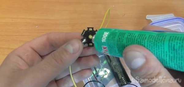 Вначале сборки закрепляем светодиод при помощи силикона на крышке коробочки. Предварительно на крышке нужно просверлить отверстие, чтобы светодиод светил через него.