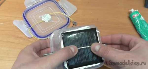 Также силиконом приклеиваем солнечную батарейку на обратной части коробочки.