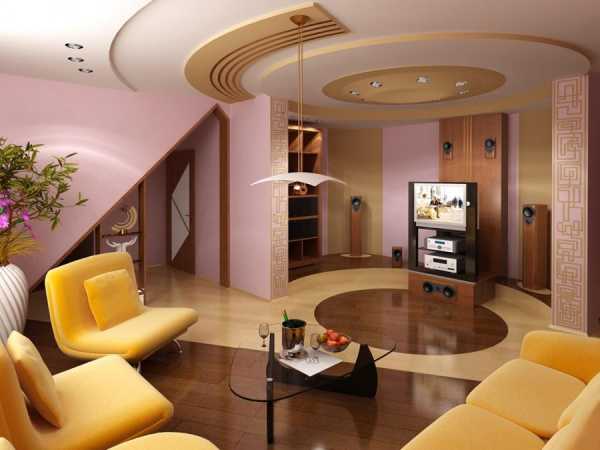 В современном дизайне используются навесные или натяжные потолки. Они могут иметь глянцевое оформление, что визуально значительно увеличивает высоту помещения. Встроенные элементы искусственного освещения помогут зонировать комнату.