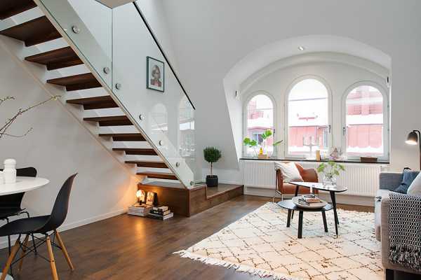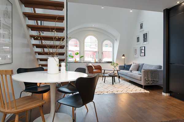 Когда две семьи живут в одном доме, он именуется дуплекс. Такое здание, например, расположено в Stockholm, крупнейшем городе и столице Швеции. Двухуровневые апартаменты занимают 55 квадратных метров площади. Они выдержаны в едином стиле: светлые тона, контрастирующие с тёмными полами цвета дерева.