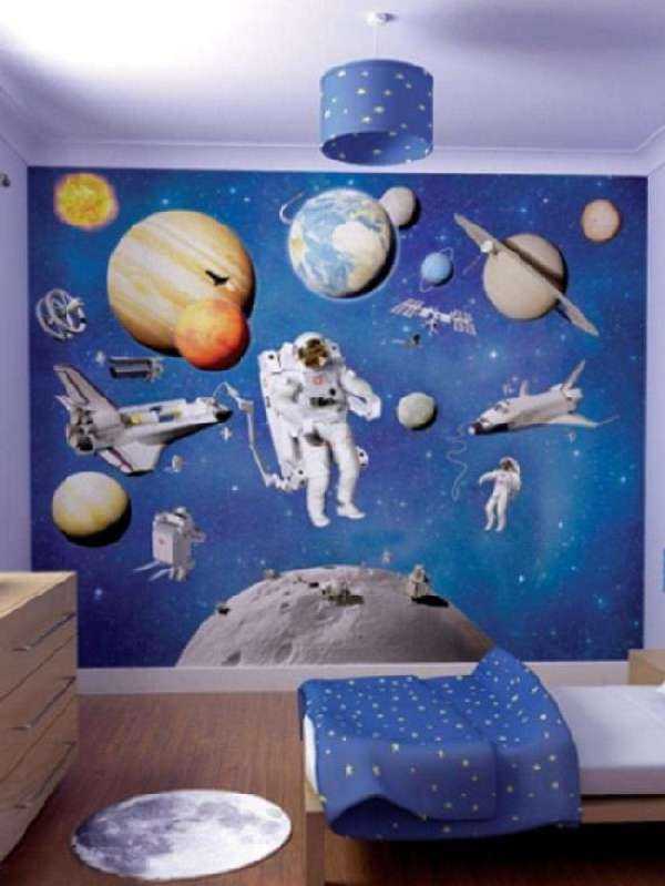 Например, фотообои в детскую с изображением космоса. Такой волшебный вариант точно понравится и мальчишкам и девчонкам.