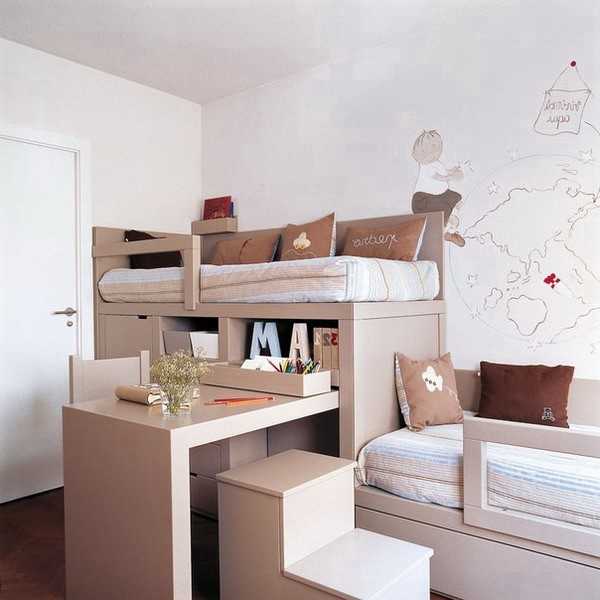 А как быть, если у вас не один, и даже не два, а несколько детей, но не места для детской для каждого из них? Не беда, можно спланировать вашу детскую так, чтобы в ней поместилось несколько детей. Например, вот варианты трехярусной кровати для трех детей.