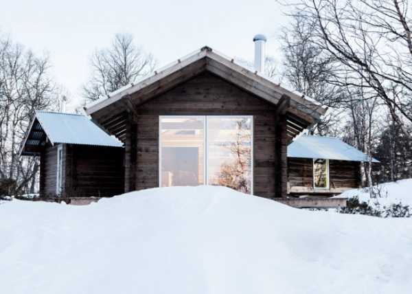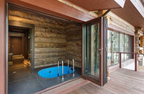 На фото — оригинальное планировочное решение бани, состоящей из трех пространств: основной постройки с парной, зоны бассейна под стеклянной крышей и беседки. Все части здания построены из бревна, а крыша выступает объединяющим элементом, придающим бане архитектурную целостность.
