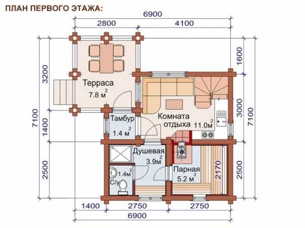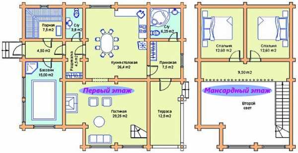 В первом случае парная и моечная являются основными помещениями, которые располагаются на первом этаже строения, и дополняется комнатой отдыха на втором.