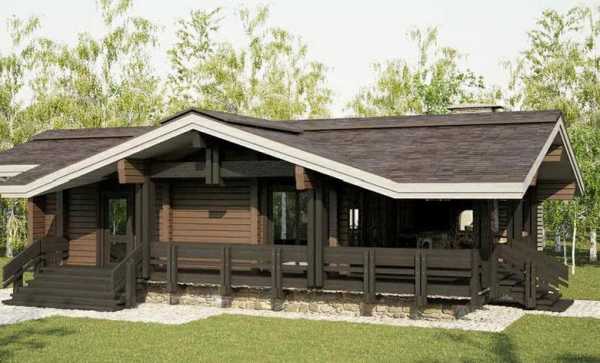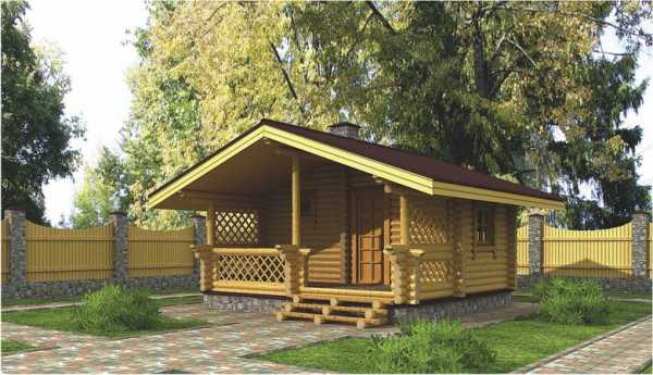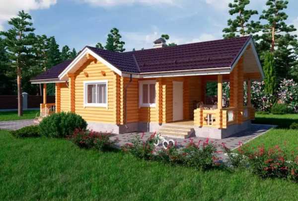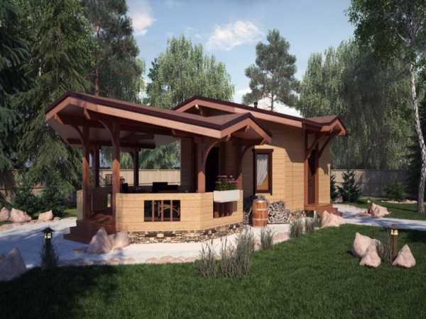 Красивы по архитектуре одноэтажные брусовые бани с верандой или беседкой под двускатной крышей из гибкой черепицы. Особенно колоритно смотрятся фасады из бруса, окрашенного в светлые тона и скомбинированного с темным кровельным покрытием.
