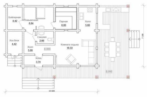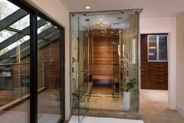 Существует также и другой, более холостяцкий вариант дома-бани, где основной акцент сделан на неотъемлемые атрибуты бани (парную, душевую, тамбур, комнату отдыха, бильярдную и даже бассейн) с жилой комнатой, которая скорее напоминает квартиру-студию.