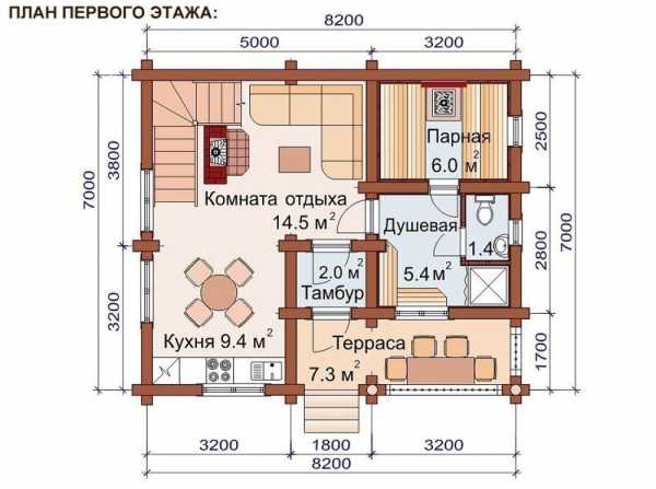 Первый этаж бани из бруса с мансардной представляет из себя классический вариант русской бани с комнатой отдыха, парной и помывочной.