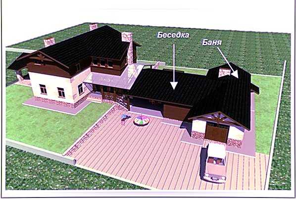 Объединить три строения, различных по степени сложности и назначению, можно только после консультации с архитектором. Они требуют особого подхода, в первую очередь тогда, когда проекты бани с беседкой под одной крышей не были включены в часть жилого дома.