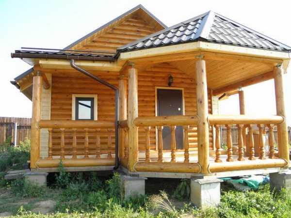 Отличным дополнением к экстерьеру бани с многогранной беседкой из сруба станет ограждение из резных балясин в русском стиле. Интересный штрих в дизайн постройки внесет коричневая крыша из металлочерепицы.