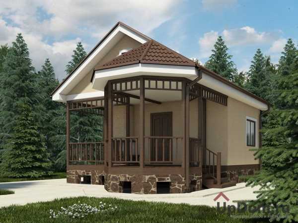 Угловой одноэтажный гостевой домик с баней – это интересное решение для небольшого участка. Здесь есть все необходимое для отдыха, но переночевать, при необходимости, получится, только разместившись на диване в комнате отдыха – отдельных спален в домике не предусмотрено.
