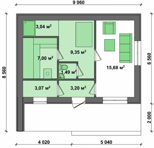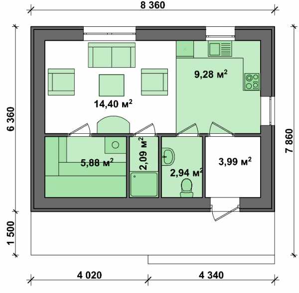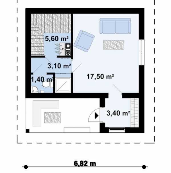 Несмотря на бо́льший периметр постройки, полезная площадь этого гостевого домика ограничена размерами 5,5 на 5,5 метра не считая террасы. Даже таких размеров вполне достаточно для временного или постоянного проживания небольшой семьей или периодическими посещениями дружеской компании.