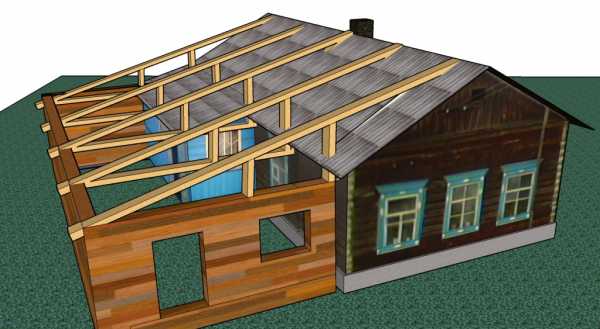 - Полноценный пристрой сруба к одной из стен — тогда парная, предбанник и помывочная заключены в собственные четыре стены. При этом кровельная конструкция дома продляется, закрывая, вновь обретенный пристрой;