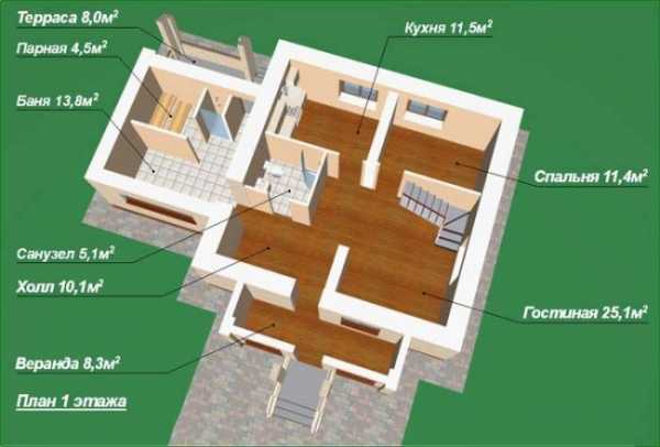 Также дом с баней может быть cпроектирован изначально, и в этом случае парная и моечная будут находиться непосредственно внутри периметра коттеджа, заменяя собой один из санузлов.