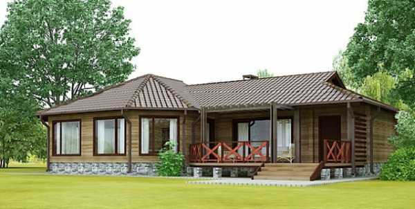 Если вы любитель современного стиля — постройте баню из сруба с просторной террасой под односкатной кровлей выгнутой формы. Бревенчатые фасады в комбинации с наклонными опорами, металлическим кровельным настилом и каменным цоколем будут выглядеть очень нестандартно.