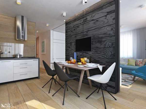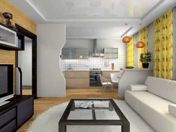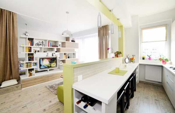 Π Π½Π°ΡΠ΅ΠΉ ΡΡΡΠ°Π½Π΅ Π±ΠΎΠ»Π΅Π΅ ΠΏΠΎΠΏΡΠ»ΡΡΠ΅Π½ Π΄ΠΈΠ·Π°ΠΉΠ½ ΠΈΠ½ΡΠ΅ΡΡΠ΅ΡΠ° ΡΡΡΠ΄ΠΈΠΈ Ρ ΠΊΡΡ Π½Π΅ΠΉ, Π³Π΄Π΅ ΠΎΠ΄Π½Ρ ΡΡΠ΅Π½Ρ Π·Π°Π½ΠΈΠΌΠ°Π΅Ρ ΠΎΠ±ΡΡΠ½ΡΠΉ Π²ΡΡΡΠ°ΠΈΠ²Π°Π΅ΠΌΡΠΉ Π³Π°ΡΠ½ΠΈΡΡΡ, Π° ΠΎΡ Π·ΠΎΠ½Ρ ΠΎΡΠ΄ΡΡ Π° ΠΎΠ½Π° ΠΎΡΠ΄Π΅Π»Π΅Π½Π° Π±Π°ΡΠ½ΠΎΠΉ ΡΡΠΎΠΉΠΊΠΎΠΉ, ΠΊΠΎΡΠΎΡΠ°Ρ ΠΈ ΠΈΠ³ΡΠ°Π΅Ρ ΡΠΎΠ»Ρ ΠΎΠ±Π΅Π΄Π΅Π½Π½ΠΎΠ³ΠΎ ΡΡΠΎΠ»Π°. ΠΠ΅ΡΠ΅Π΄ΠΊΠΎ Π² ΡΠ°ΠΊΠΎΠΉ ΠΏΠ»Π°Π½ΠΈΡΠΎΠ²ΠΊΠ΅ ΠΈΡΠΏΠΎΠ»ΡΠ·ΡΡΡΡΡ ΠΈ Π΄ΠΎΠΏΠΎΠ»Π½ΠΈΡΠ΅Π»ΡΠ½ΡΠ΅ ΠΏΠ΅ΡΠ΅Π³ΠΎΡΠΎΠ΄ΠΊΠΈ Ρ ΠΏΡΠΎΠ΅ΠΌΠ°ΠΌΠΈ ΠΈ ΡΡΠ΅Π»Π»Π°ΠΆΠΈ, Π²ΠΈΠ·ΡΠ°Π»ΡΠ½ΠΎ ΠΎΡΠ΄Π΅Π»ΡΡΡΠΈΠ΅ ΠΈ Π·ΠΎΠ½Ρ ΠΏΡΠΈΡ ΠΎΠΆΠ΅ΠΉ. Π’Π°ΠΊΠΎΠΉ ΠΏΠΎΠ΄Ρ ΠΎΠ΄ Ρ ΠΎΡΡ ΠΈ Π½Π΅ΡΠΊΠΎΠ»ΡΠΊΠΎ ΡΠΌΠ΅Π½ΡΡΠ°Π΅Ρ Π²ΠΈΠ·ΡΠ°Π»ΡΠ½ΠΎ ΠΎΠ±ΡΡΡ ΠΏΠ»ΠΎΡΠ°Π΄Ρ, Π½ΠΎ ΠΏΠΎΠ·Π²ΠΎΠ»ΡΠ΅Ρ Π΄Π°ΠΆΠ΅ ΠΈΠ· Π½Π΅Π±ΠΎΠ»ΡΡΠΎΠΉ ΡΡΡΠ΄ΠΈΠΈ ΡΠ΄Π΅Π»Π°ΡΡ ΠΏΠΎΠ»Π½ΠΎΡΠ΅Π½Π½ΡΡ ΠΎΠ΄Π½ΠΎΠΊΠΎΠΌΠ½Π°ΡΠ½ΡΡ ΠΊΠ²Π°ΡΡΠΈΡΡ.