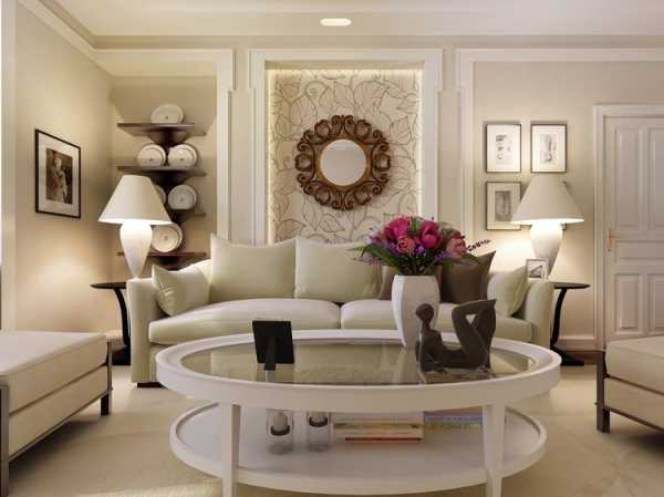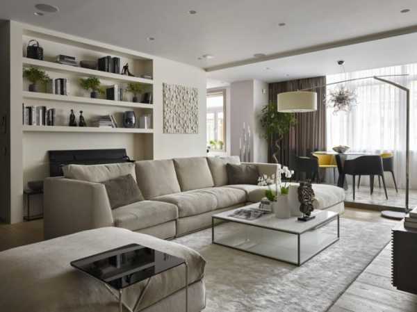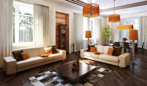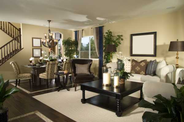 Бежевый цвет и его оттенки занимают лидирующее место в оформлении гостиной. Так как гостиная чаще всего применяется для места отдыха после тяжелого рабочего дня, то коричневые оттенки будут способствовать расслаблению. Бежевый прекрасно сочетаются с другими цветами, а также он практичен и визуально увеличивает комнату.