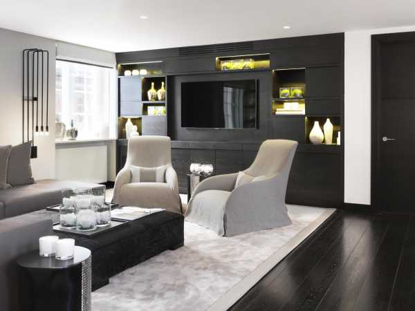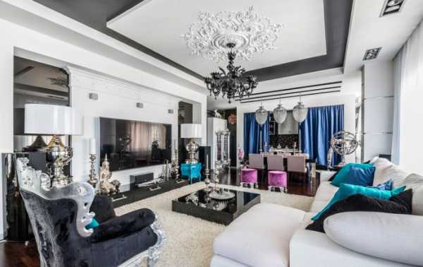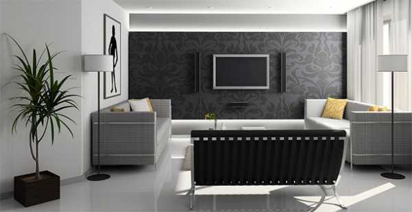 Не надо боятся черного цвета в дизайне. Он выглядит роскошно и благородно. Главное – это правильно скомбинировать его с остальными цветами. Конечно, самый популярный дуэт черного с белым (темные стены-светлый потолок). Также для гостиной подойдет сочетание черного с золотым или серым цветами.