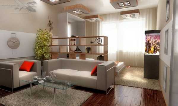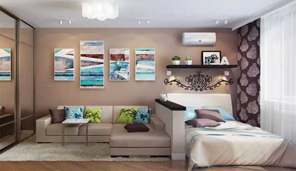 Если мы имеем стандартную однокомнатную квартиру с изолированной кухней, а размеры комнаты позволяют – вполне возможно разделить ее на две зоны. В одной из них организовать небольшую и уютную спальню, вторую обустроить для отдыха и приема гостей.