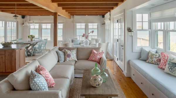 Также многие хозяева частных домов предпочитают и стены, и потолки делать деревянными. Отлично с этим справляется деревянная вагонка. Если в гостиной есть большое окно, которое открывает невероятной красоты вид, то всю комнату лучше сделать в нейтральных тонах с минимум аксессуаров. Так весь акцент будет приходиться именно на окно.