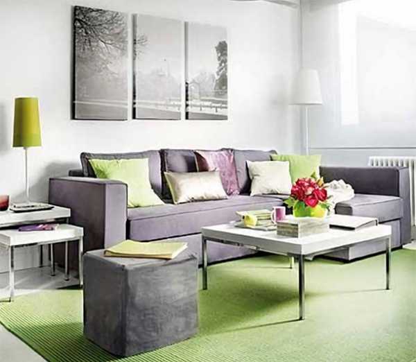 На пол можно положить или линолеум, или ламинат. Но не надо класть на пол ковры большого размера. Идеальный вариант: небольшой коврик возле дивана.