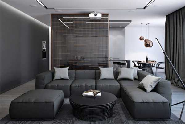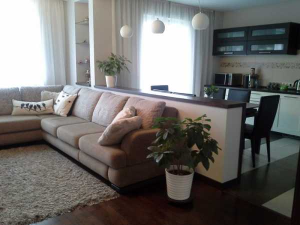 А вот другой вариант. На этом фото оформление гостиной в квартире также предусматривает зонирование. Здесь общее пространство разделено на зоны при помощи дивана.
