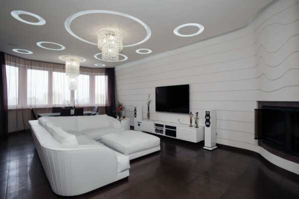 Подвесной потолок в виде рисунка смотрится эффектно, особенно в просторной и высокой гостиной. В маленьком пространстве такой вариант будет совершенно неуместен.
