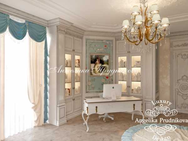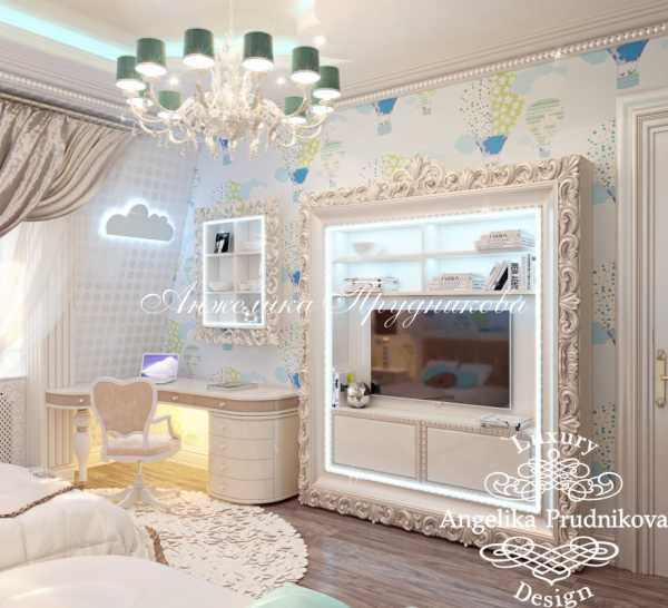На фото: Дизайн детской комнаты в классическом стиле в ЖуковкеИзящный белый стол на гнутых ножках в комплекте с парой высоких стеллажей – это уже не просто рабочее место, а настоящий кабинет с библиотекой. А чтобы мебельная композиция выглядела законченной и не утяжеляла пространство, ее лучше разместить в углу, подчеркнуть лепным декором и декорировать встроенной подсветкой.