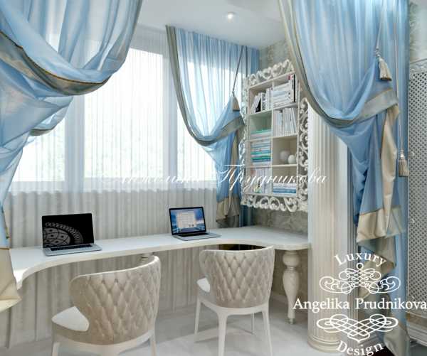На фото: Дизайн комнаты для девочки в ЖК «Камелот»На присоединенной лоджии можно оборудовать не просто рабочее место, а настоящий мини-кабинет для двух сестер с одним большим столом, двумя подвесными стеллажами и двумя удобными креслами. А чтобы эта зона смотрелась гармонично, Анжелика Прудникова выделила ее круглыми колоннами и декорировала шторами из голубого шелка в стилистике интерьера.