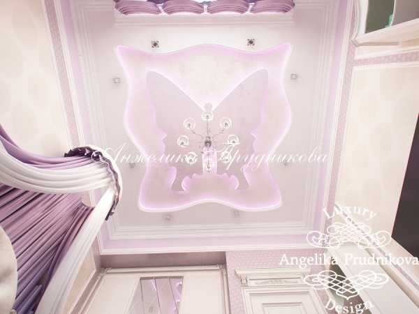 На фото: Дизайн детской комнаты для девочки в ЖК «Садовые Кварталы»Подвесная потолочная конструкция в форме бабочки, подсвеченная цветной светодиодной лентой, станет главным украшением детской комнаты с классической лепниной, зеркалами и сиреневыми обоями. Главное – подобрать люстру подходящего дизайна.