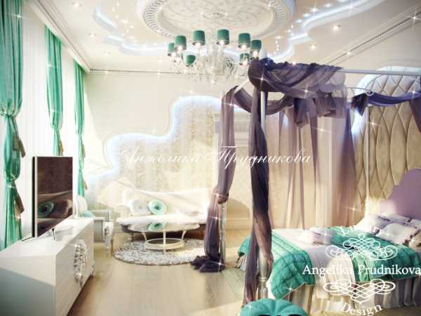 На фото: Дизайн комнаты для девушкиДетали фиолетового и бирюзового цвета очень эффектно смотрятся в оформленной в светлых тонах комнате в стиле арт-деко для девочки старше 13 лет. В качестве акцентных элементов можно использовать декоративные подушки, покрывало, шторы, полог и люстру с яркими плафонами.
