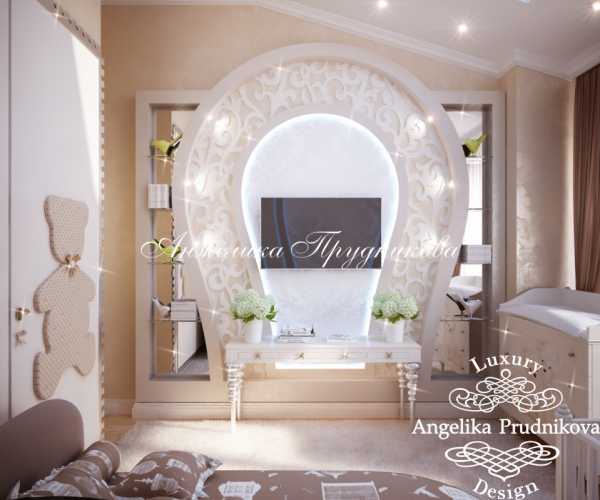 На фото: Дизайн детской комнаты с мишкойДекорированный зеркалами стеллаж с фигурной конструкцией для размещения ТВ больше похож на арт-объект, чем на утилитарный предмет интерьера. Он прекрасно впишется в дизайн детской комнаты для девочки в стиле арт-деко. А встроенные светильники и голубые светодиоды сделают его еще более эффектным.