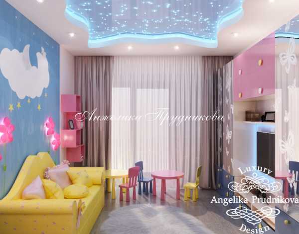 На фото: Дизайн детской в стиле модерн на Носовихинском шоссеСтолики и стулья розового, желтого и синего цветов – отличное решение для комнаты маленькой девочки, оформленной в стиле модерн. А дополнить их можно забавным стеллажом, сложенным из розовых кубиков, ярко-желтым диваном, фреской с изображением облака и оригинальными бра в виде объемных цветов.