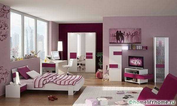 фиолетовый дизайн для подростка девочкиФиолетовый является очень популярным цветом среди девочек–подростков. Так как этот приоритет может измениться, можно сделать фиолетовой только одну стену. Тогда при желании ее можно будет перекрасить, а покрывала и аксессуары поменять на другие.