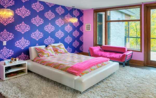 фото: комната для подростка девочки с контрастными цветамиЕсли комната для девочки подростка имеет правильное освещение, то вы смело можете себе позволить поэкспериментировать с контрастными цветами. Вашей девочке наверняка понравится этот дерзкий дизайн, сочетающий в себе цвета пурпурной сливы с лазурным синим оттенком и с разноцветными полосками, уравновешенными нейтральным цветом пола.