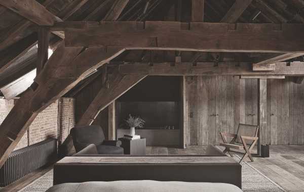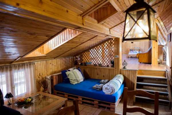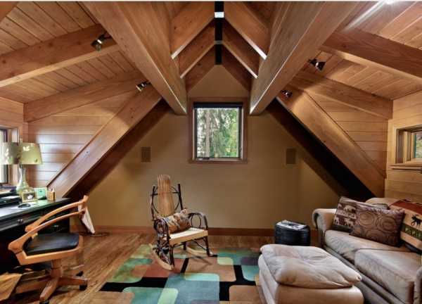 Внутреннее пространство мансарды под крышей шале очень колоритно смотрится за счет видимых стропил и дощатой обшивки.