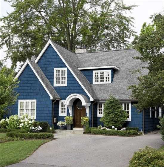 Отличительная особенность английских домов с мансардой — большой уклон скатов кровли и несколько асимметрично расположенных фронтонов. Необычность такой архитектуры усиливается за счет синего цвета фасадной отделки в сочетании с серым кровельным покрытием.