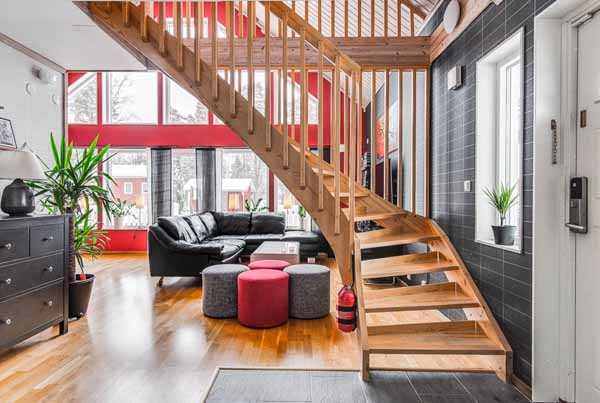 Даже, если дом строится по уже готовому и выверенному проекту, стоит обязательно обращать внимание на то, каким образом расположена конструкция лестницы, не мешает ли она свободно перемещаться и выходить из других помещений дома.
