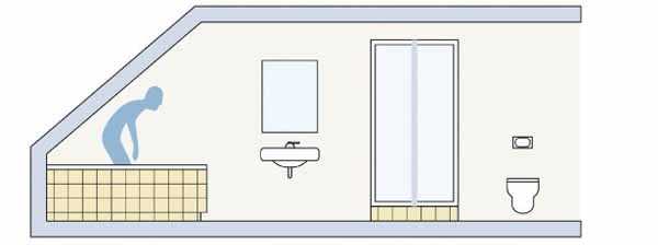 Чтобы иметь возможность удобно использовать раковину, ванну или душ их нельзя размещать непосредственно под уклоном крыши.