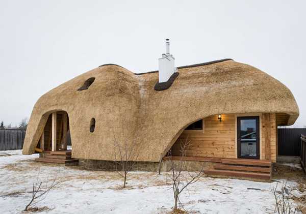 Тростник и камыш — идеальный материал для формирования округлых кровель. Такая грибовидная крыша с миниатюрными мансардными окошками станет колоритным элементом архитектуры частного дома из бруса или бревна.