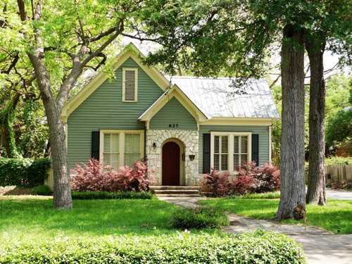 Милый колорит провинциальным английским домам придает цветовая гамма отделки фасада и деревянные ставни контрастного цвета на мансардных окнах.